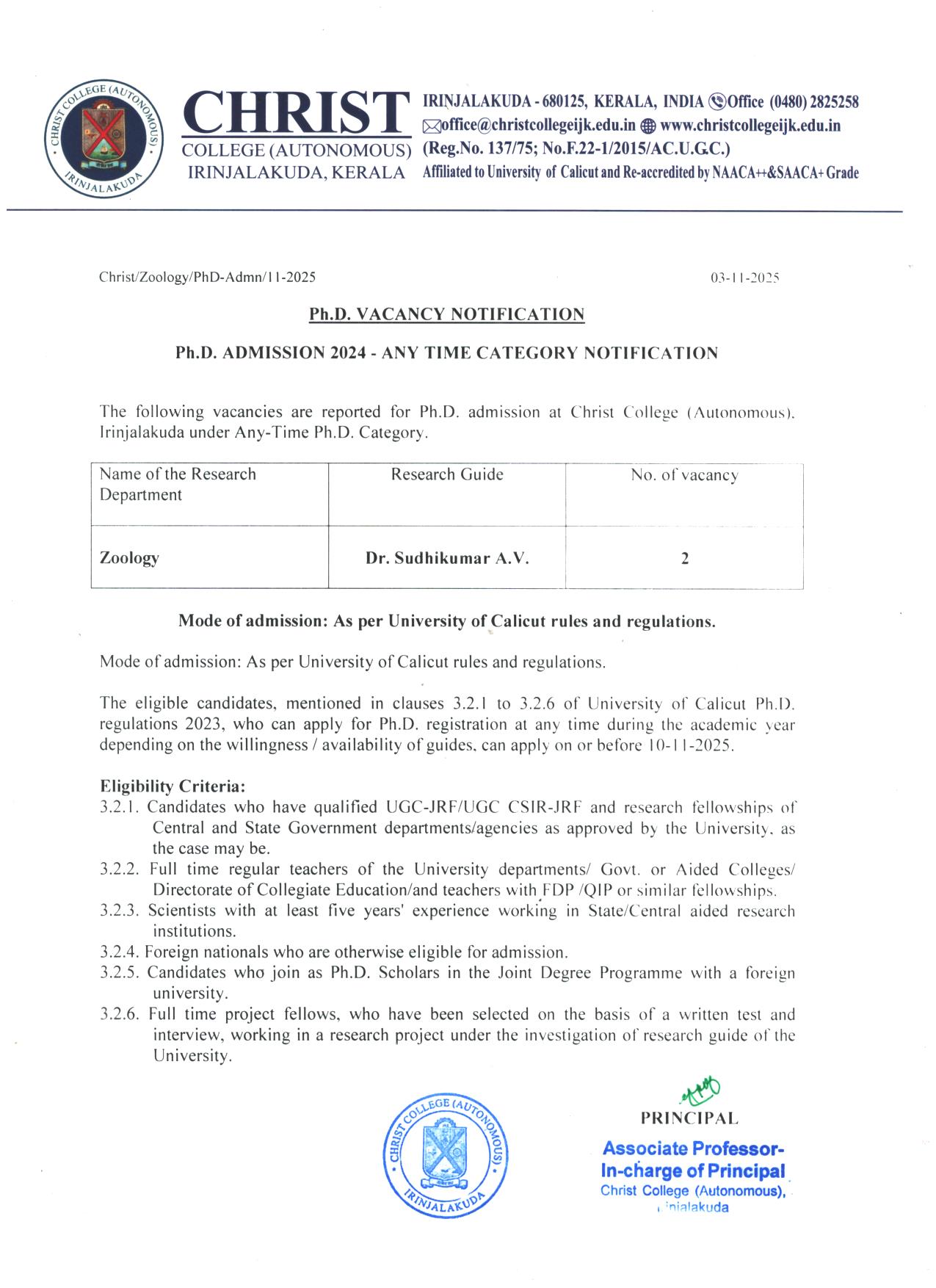 Zoology PhD Admission Anytime Category Rank List Dec 2024- Click Here