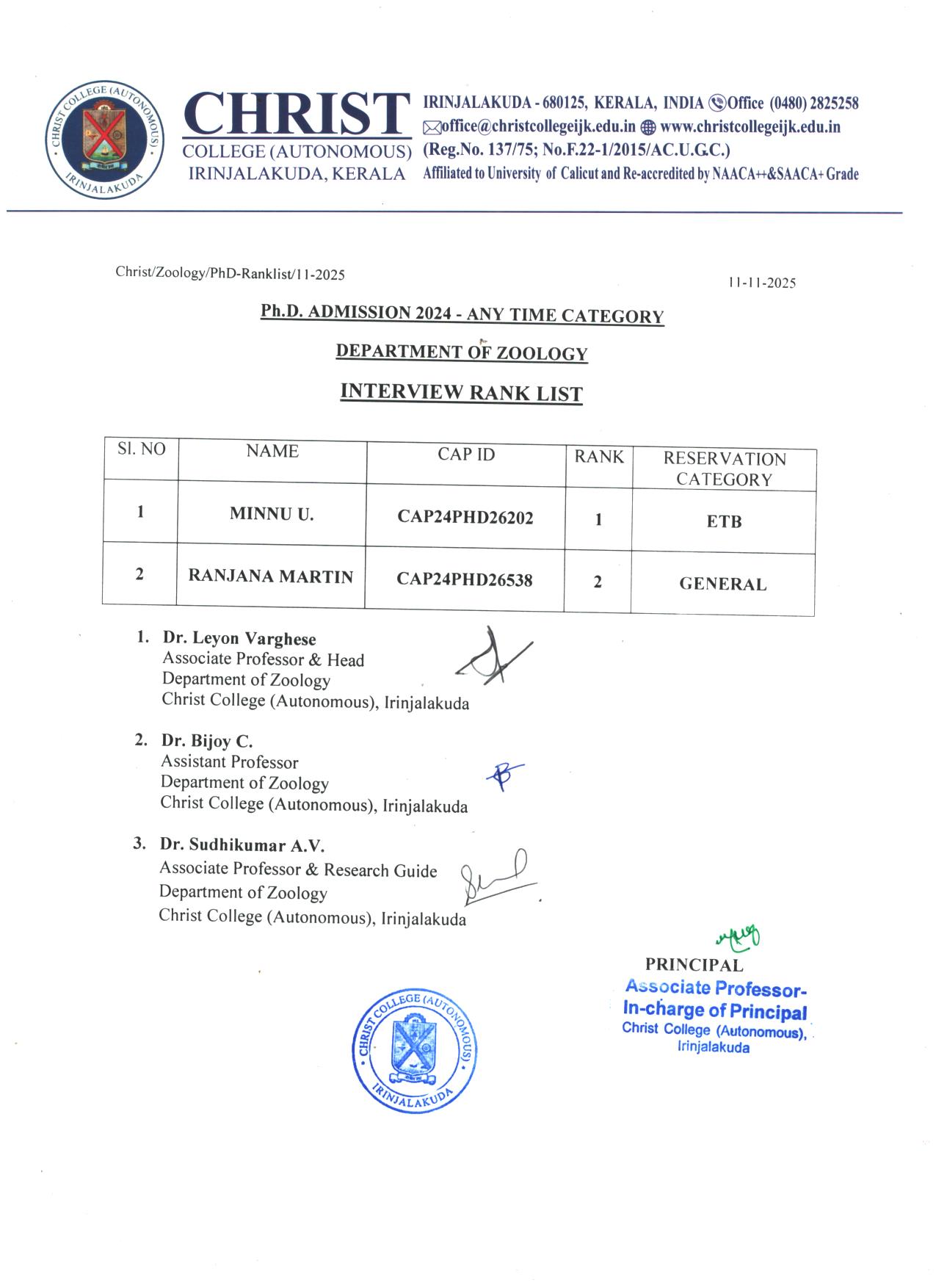Zoology PhD Admission Anytime Category Rank List Dec 2024- Click Here